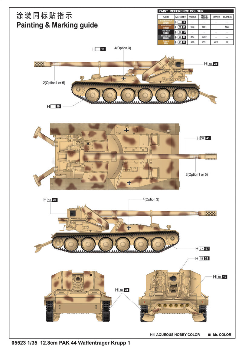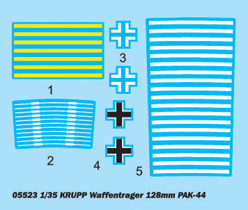 Trumpeter 5523 1/35 scale 12.8cm PAK 44 Waffentrager Krupp 1. This kit includes parts for the assembly of one plastic model kit. The set requires both glue and paint in order to be completed. Paints and glue are not included. For modelers aged 14 and older
