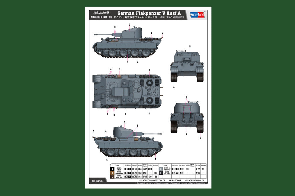 Hobby Boss 84535 1/35 scale German Flakpanzer V Ausf.A. This kit includes parts for the assembly of one plastic model kit. The set requires both glue and paint in order to be completed. Paints and glue are not included. For modelers aged 14 and older