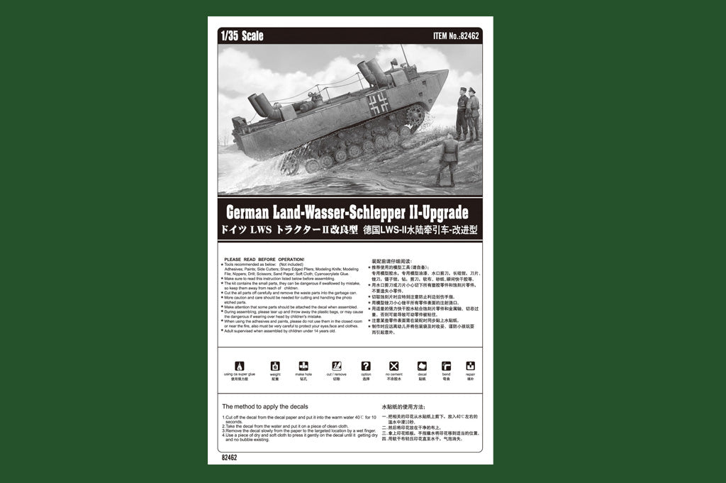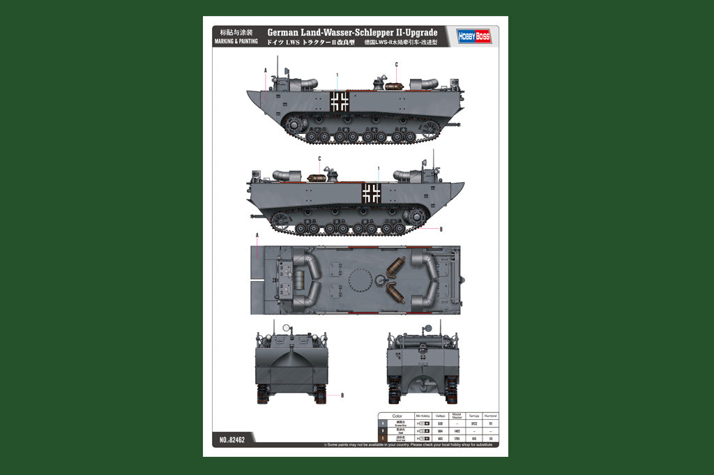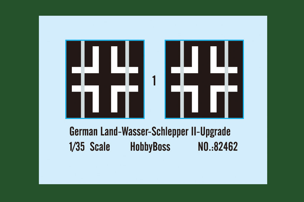 Hobby Boss 82462 1/35 scale German Land-Wasser-Schlepper II-Upgraded. This kit includes parts for the assembly of one plastic model kit. The set requires both glue and paint in order to be completed. Paints and glue are not included. For modelers aged 14 and older