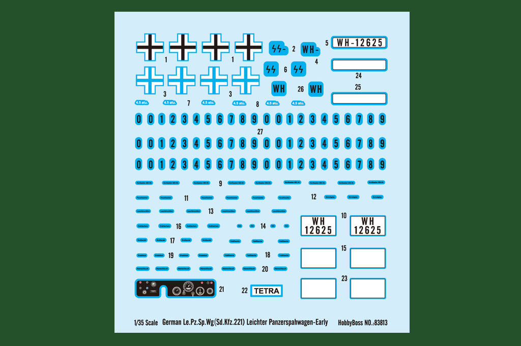 Hobby Boss 83813 1/35 scale German Le.Pz.Sp.Wg. Sd.Kfz.221 Leichter Panzerspahwagen Early. This kit includes parts for the assembly of one plastic model kit. The set requires both glue and paint in order to be completed. Paints and glue are not included. For modelers aged 14 and older