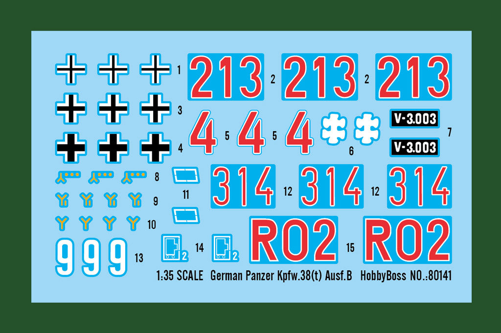 Hobby Boss 80141 1/35 scale German Panzer Kpfw.38(t) Ausf.B. This kit includes parts for the assembly of one plastic model kit. The set requires both glue and paint in order to be completed. Paints and glue are not included. For modelers aged 14 and older