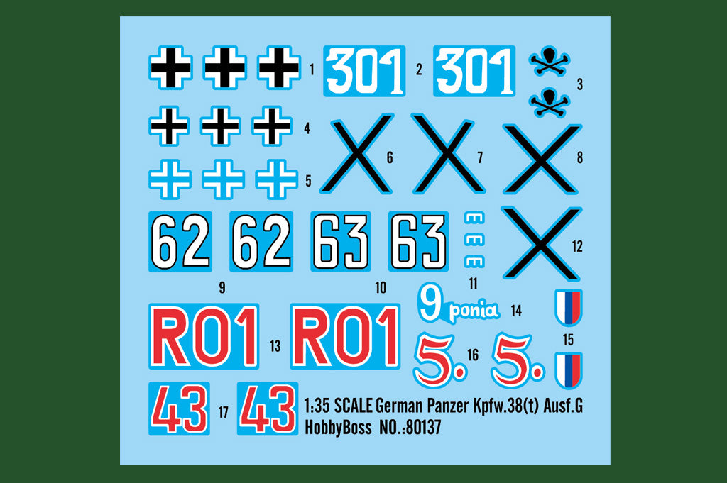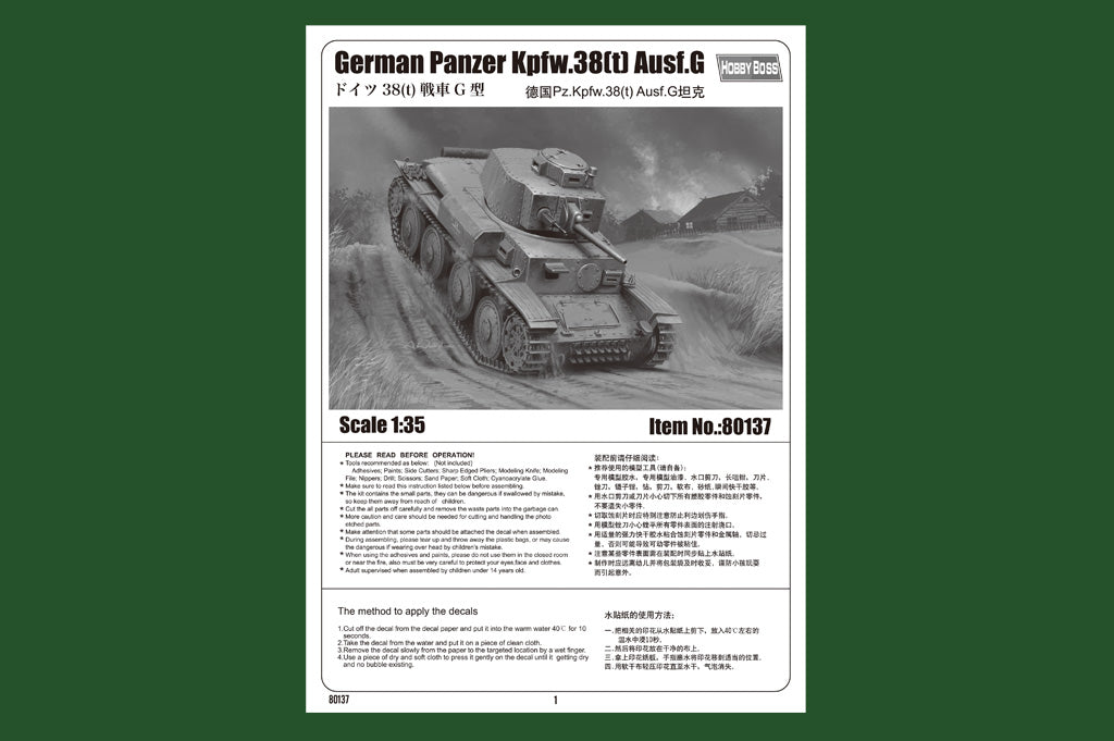 Hobby Boss 80137 1/35 scale German Panzer Kpfw.38(t) Ausf.G. This kit includes parts for the assembly of one plastic model kit. The set requires both glue and paint in order to be completed. Paints and glue are not included. For modelers aged 14 and older