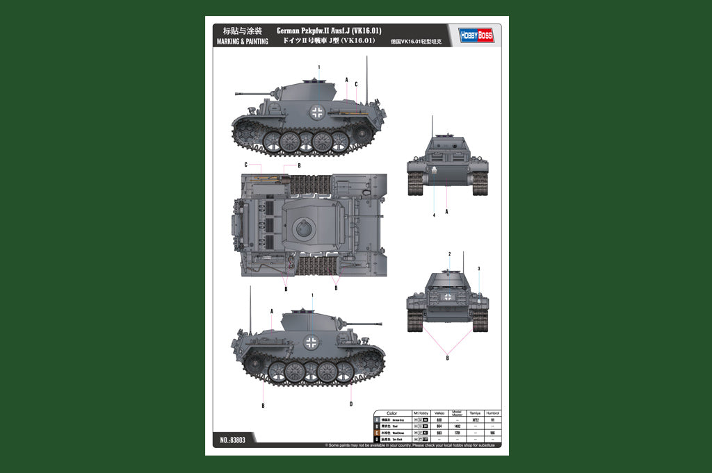 Hobby Boss 83803 1/35 scale German PzKpfw.II Ausf.J (VK1601). This kit includes parts for the assembly of one plastic model kit. The set requires both glue and paint in order to be completed. Paints and glue are not included. For modelers aged 14 and older