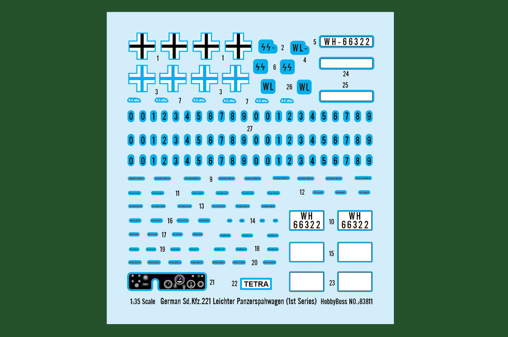 Hobby Boss 83811 1/35 scale German Sd.Kfz.221 Leichter Panzerspahwagen (1st Series). This kit includes parts for the assembly of one plastic model kit. The set requires both glue and paint in order to be completed. Paints and glue are not included. For modelers aged 14 and older