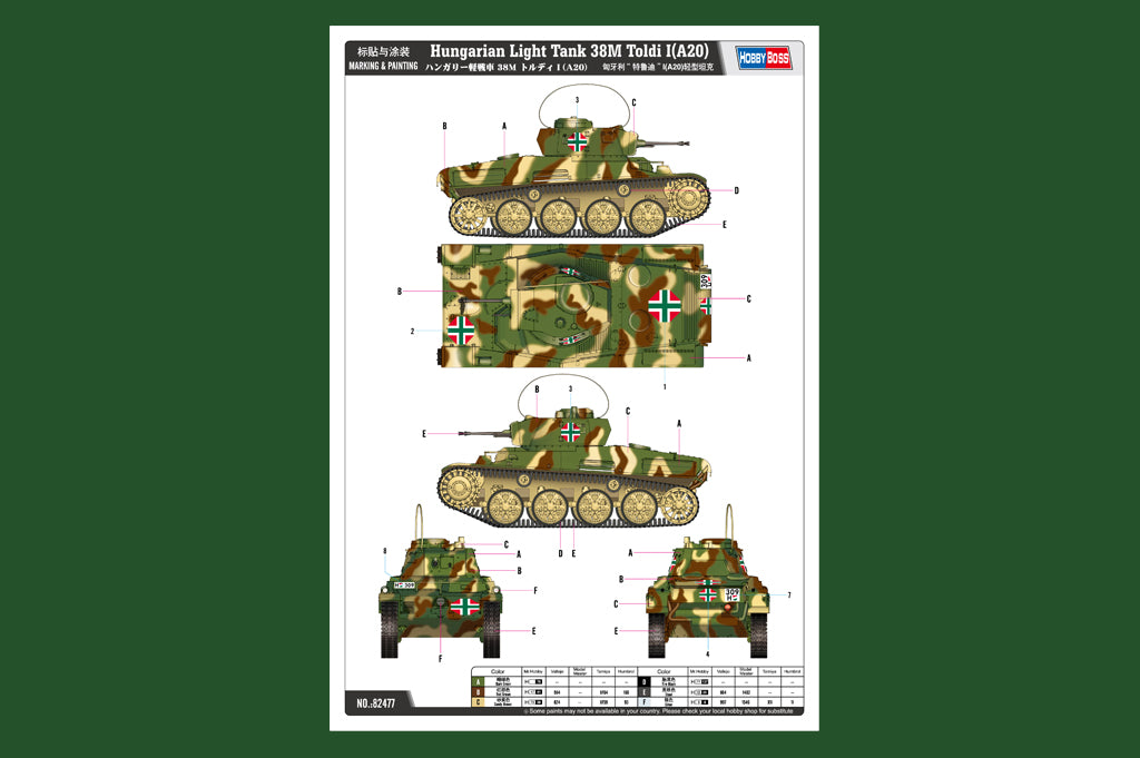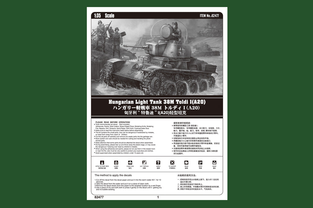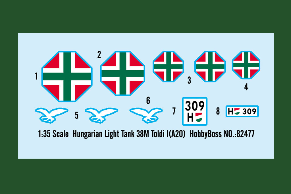 Hobby Boss 82477 1/35 scale Hungarian Light Tank 38M Toldi I (A20). This kit includes parts for the assembly of one plastic model kit. The set requires both glue and paint in order to be completed. Paints and glue are not included. For modelers aged 14 and older
