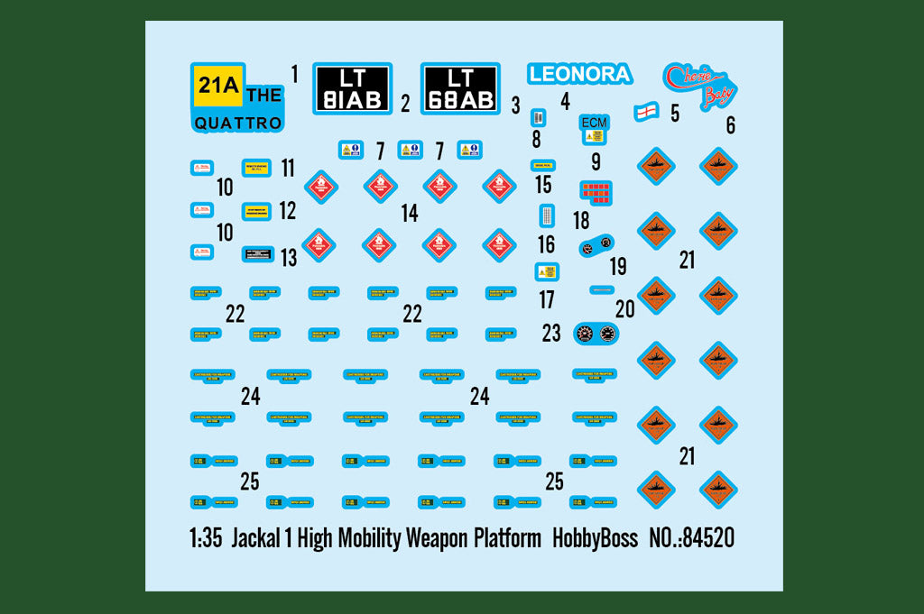 Hobby Boss 84520 1/35 scale Jackal 1 High Mobility Weapon Platform. This kit includes parts for the assembly of one plastic model kit. The set requires both glue and paint in order to be completed. Paints and glue are not included. For modelers aged 14 and older