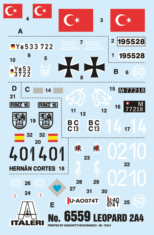Italeri 6559 1/35 scale Leopard 2A4. This kit includes parts for the assembly of one plastic model kit. The set requires both glue and paint in order to be completed. Paints and glue are not included. For modelers aged 14 and older
