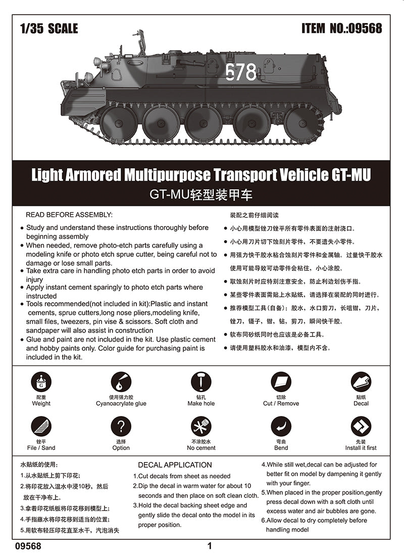 Trumpeter 9568 1/35 scale Light Armored Multipurpose Transport Vehicle GT-MU. This kit includes parts for the assembly of one plastic model kit. The set requires both glue and paint in order to be completed. Paints and glue are not included. For modelers aged 14 and older