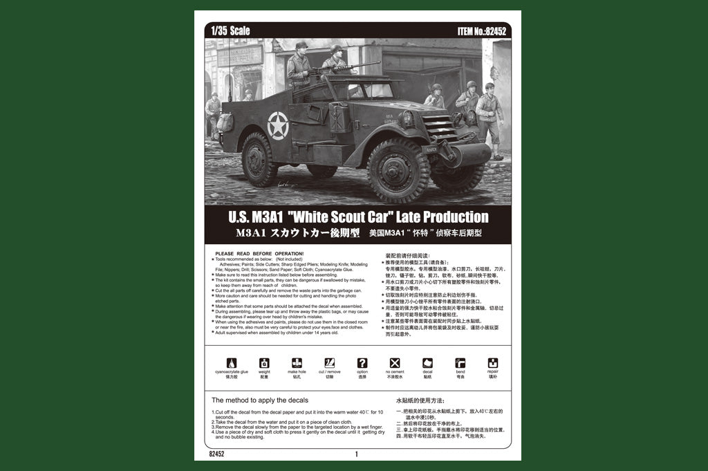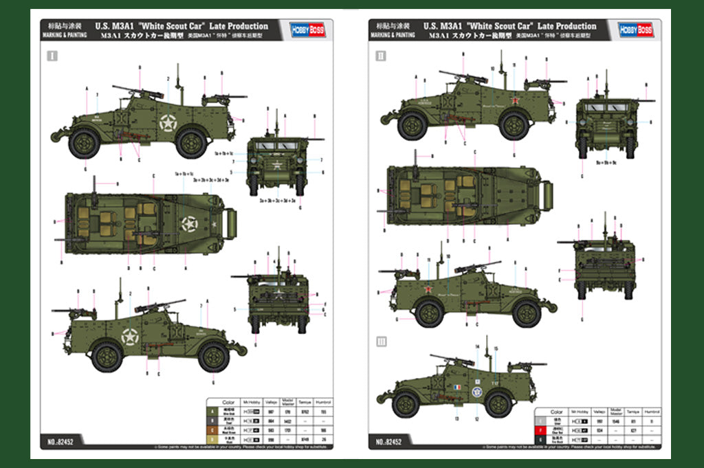 Hobby Boss 82452 1/35 scale M3A1 White Scout Car Late Production. This kit includes parts for the assembly of one plastic model kit. The set requires both glue and paint in order to be completed. Paints and glue are not included. For modelers aged 14 and older
