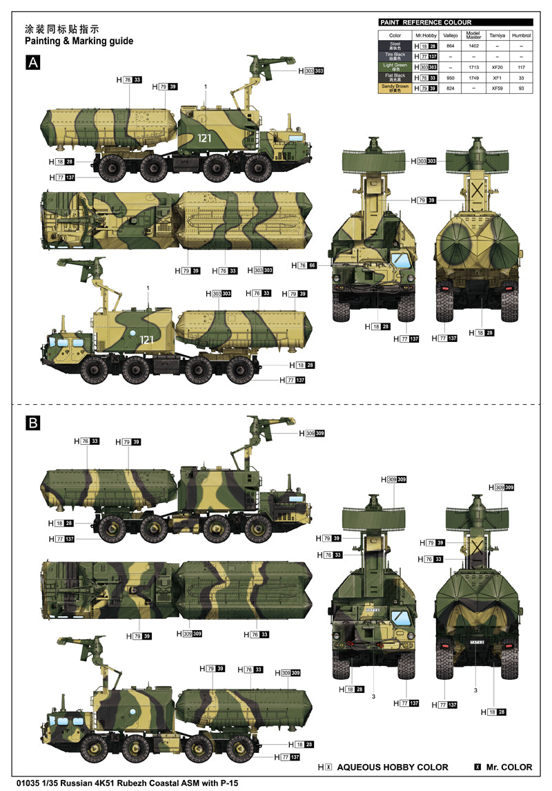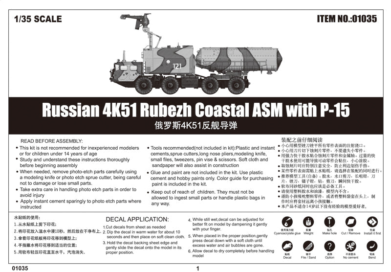Trumpeter 1035 1/35 scale Russian 4K51 Rubezh Coastal ASM with P-15. This kit includes parts for the assembly of one plastic model kit. The set requires both glue and paint in order to be completed. Paints and glue are not included. For modelers aged 14 and older
