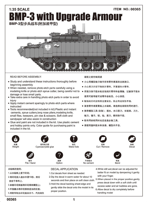 Trumpeter 365 1/35 scale Russian BMP-3 w/ERA tiles. This kit includes parts for the assembly of one plastic model kit. The set requires both glue and paint in order to be completed. Paints and glue are not included. For modelers aged 14 and older