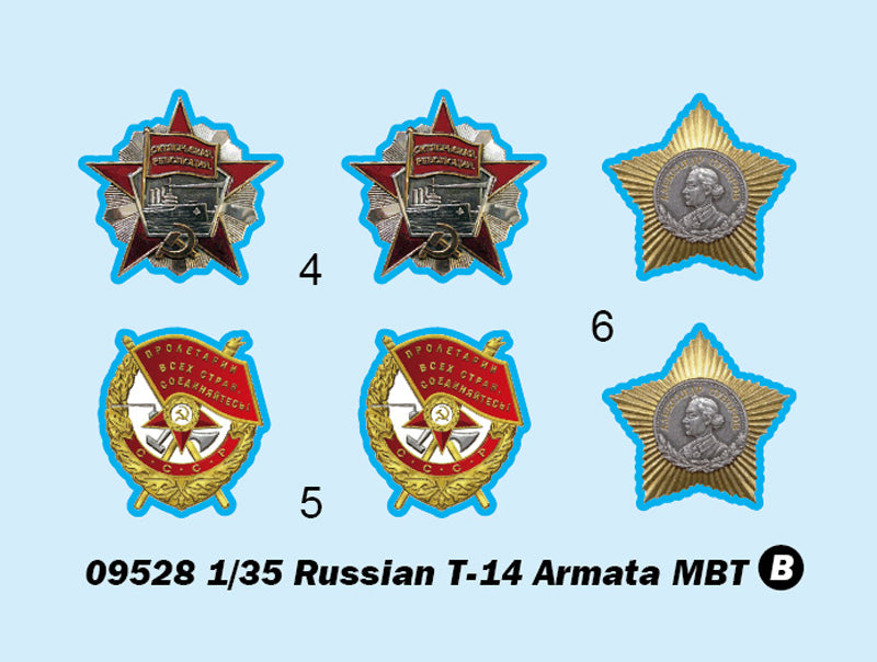 Trumpeter 9528 1/35 scale Russian T-14 Armata MBT. This kit includes parts for the assembly of one plastic model kit. The set requires both glue and paint in order to be completed. Paints and glue are not included. For modelers aged 14 and older