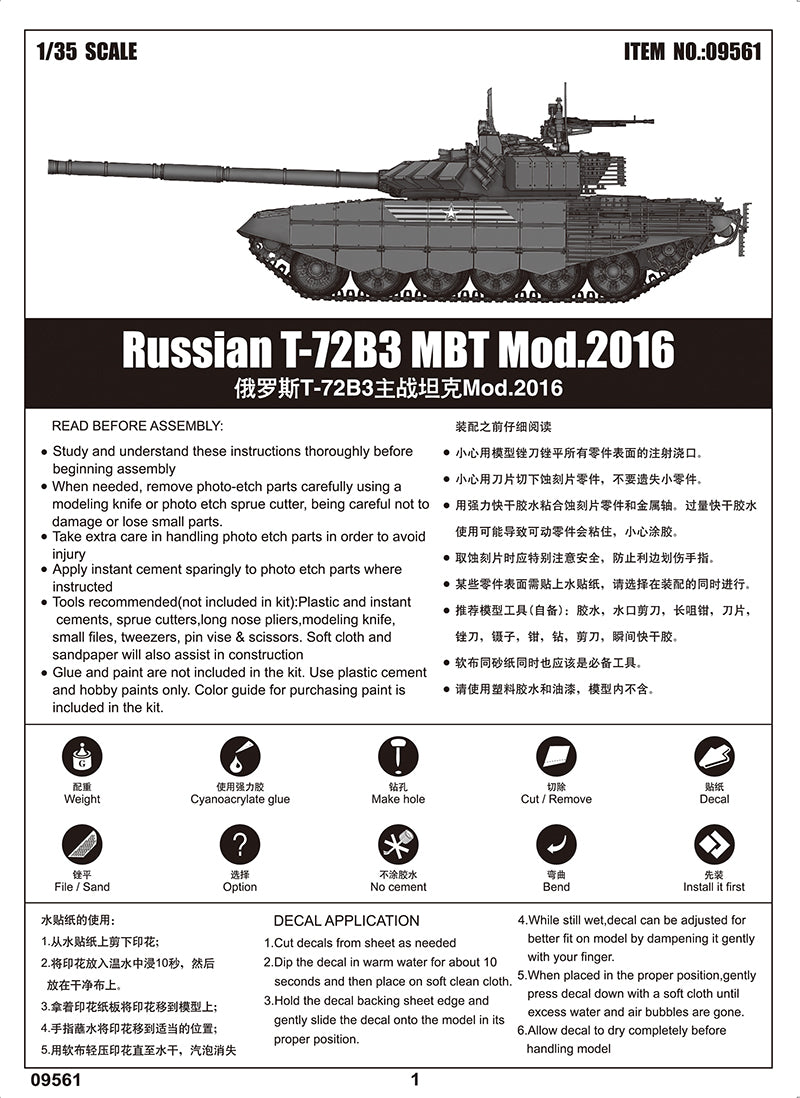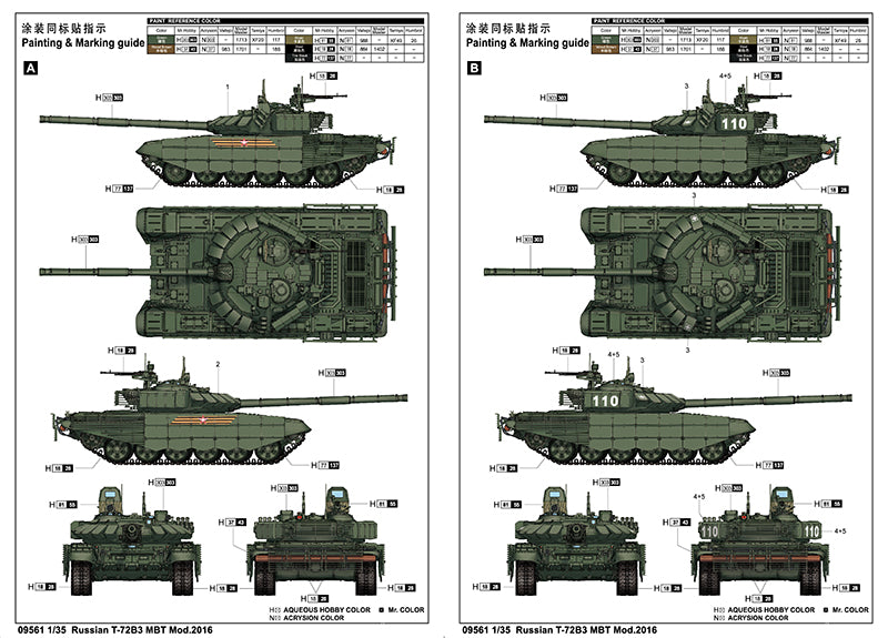 Trumpeter 9561 1/35 scale Russian T-72B3 MBT. This kit includes parts for the assembly of one plastic model kit. The set requires both glue and paint in order to be completed. Paints and glue are not included. For modelers aged 14 and older