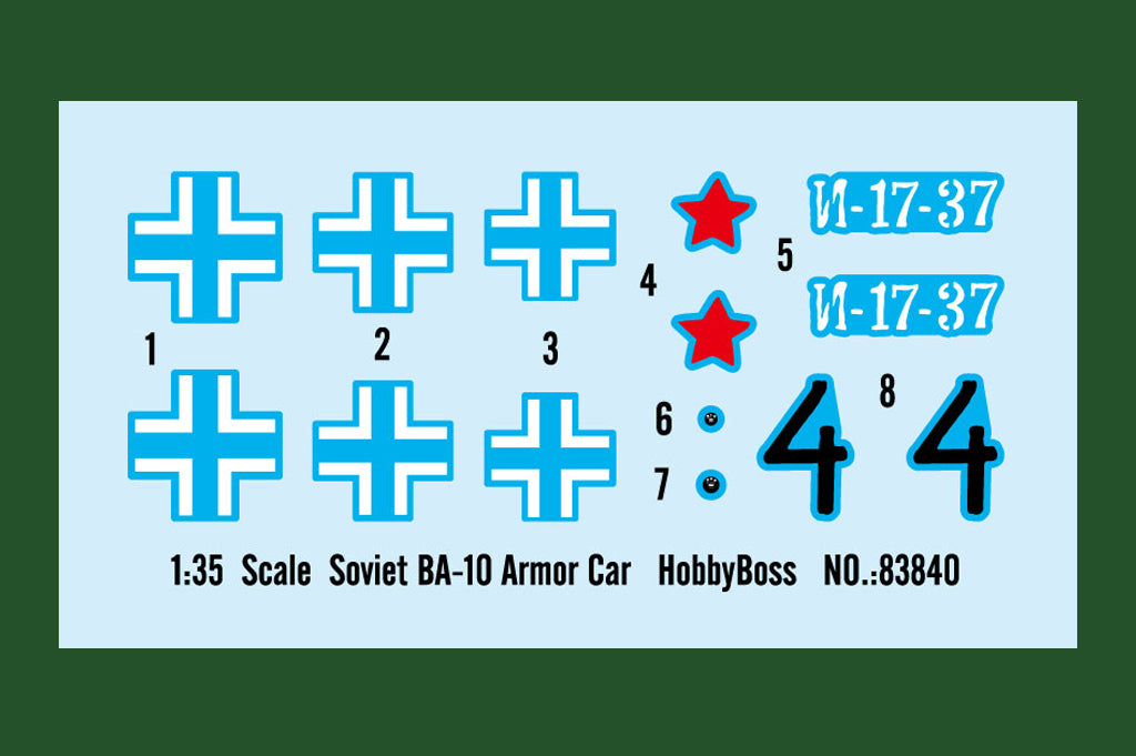 Hobby Boss 83840 1/35 scale Soviet BA-10 Armor Car. This kit includes parts for the assembly of one plastic model kit. The set requires both glue and paint in order to be completed. Paints and glue are not included. For modelers aged 14 and older