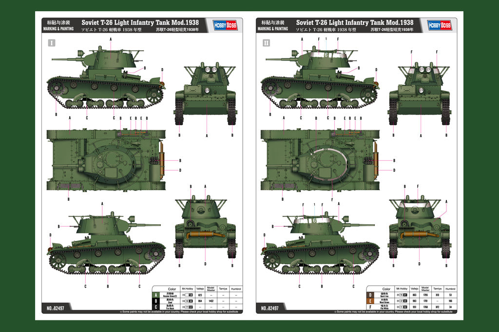 Hobby Boss 82497 1/35 scale Soviet T26 Light Infantry Tank Mod.1938. This kit includes parts for the assembly of one plastic model kit. The set requires both glue and paint in order to be completed. Paints and glue are not included. For modelers aged 14 and older