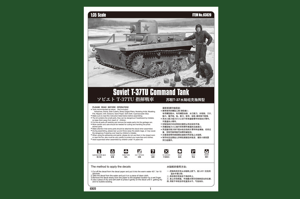 Hobby Boss 83820 1/35 scale Soviet T37TU Command Tank. This kit includes parts for the assembly of one plastic model kit. The set requires both glue and paint in order to be completed. Paints and glue are not included. For modelers aged 14 and older