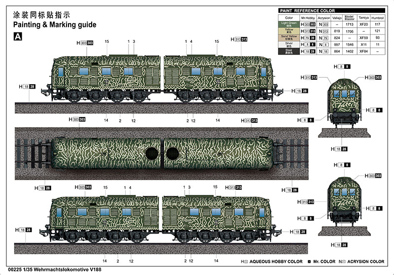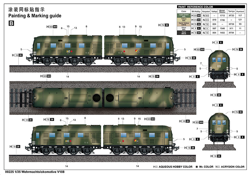 Trumpeter 225 1/35 scale Wehrmachtslokomotive V188. This kit includes parts for the assembly of one plastic model kit. The set requires both glue and paint in order to be completed. Paints and glue are not included. For modelers aged 14 and older