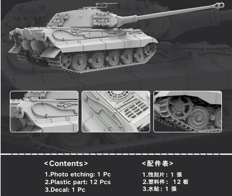 Flyhawk 3020 1/72 scale Pz.Kpfw.Vi Ausf.B Konigstiger (Original Turret Version). This kit includes parts for the assembly of one plastic model kit. The set requires both glue and paint in order to be completed. Paints and glue are not included. For modelers aged 14 and older