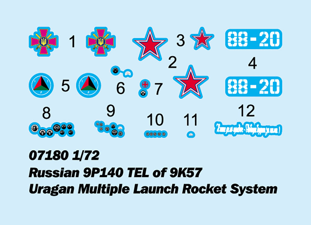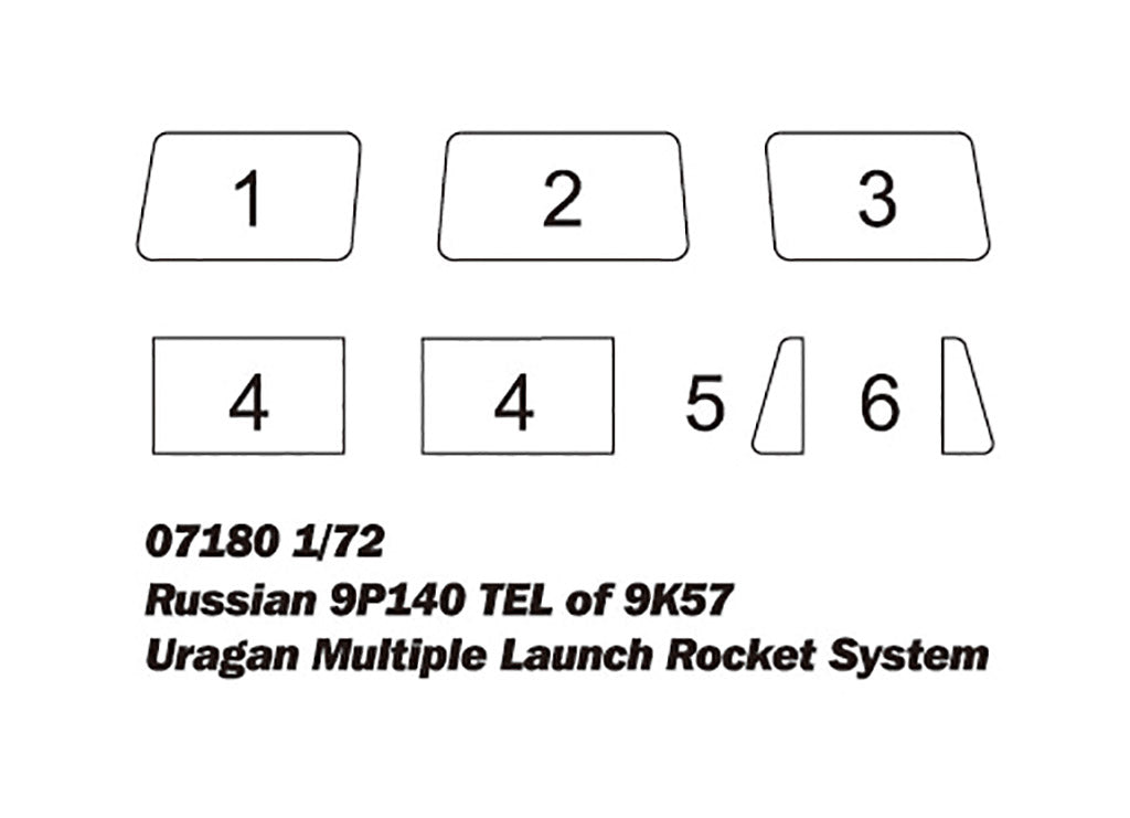 Trumpeter 7180 1/72 scale Russian 9P140 TEL of 9K57 Uragan Multiple Launch Rocket System. This kit includes parts for the assembly of one plastic model kit. The set requires both glue and paint in order to be completed. Paints and glue are not included. For modelers aged 14 and older