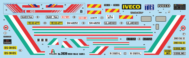 Italeri 3939 1/24 scale Iveco Turbostar 19042 Canvas w/Elevator. This kit includes parts for the assembly of one plastic model kit. The set requires both glue and paint in order to be completed. Paints and glue are not included. For modelers aged 14 and older