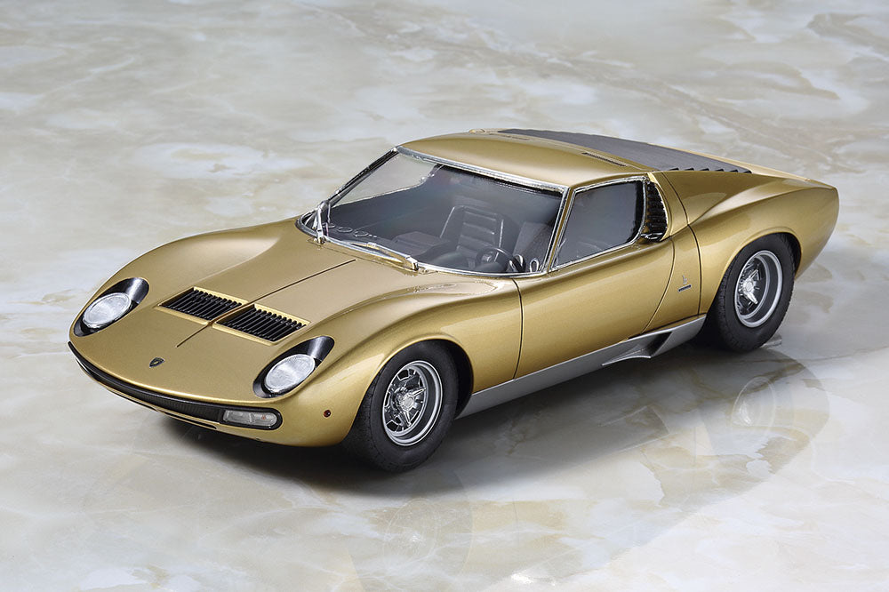 Hasegawa 20319 1/24 scale Lamborghini Miura P400 SV Chassis #5030 Gold Restoration. This kit includes parts for the assembly of one plastic model kit. The set requires both glue and paint in order to be completed. Paints and glue are not included. For modelers aged 14 and older