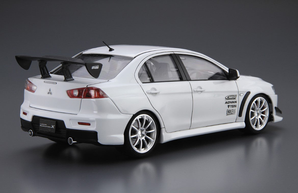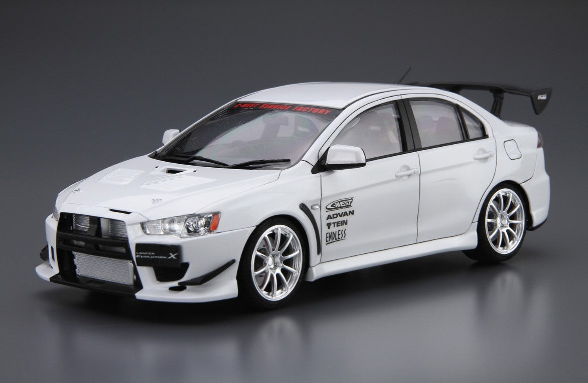 Aoshima 58978 1/24 scale Mitsubishi Lancer Evolution '07 C West. This kit includes parts for the assembly of one plastic model kit. The set requires both glue and paint in order to be completed. Paints and glue are not included. For modelers aged 14 and older