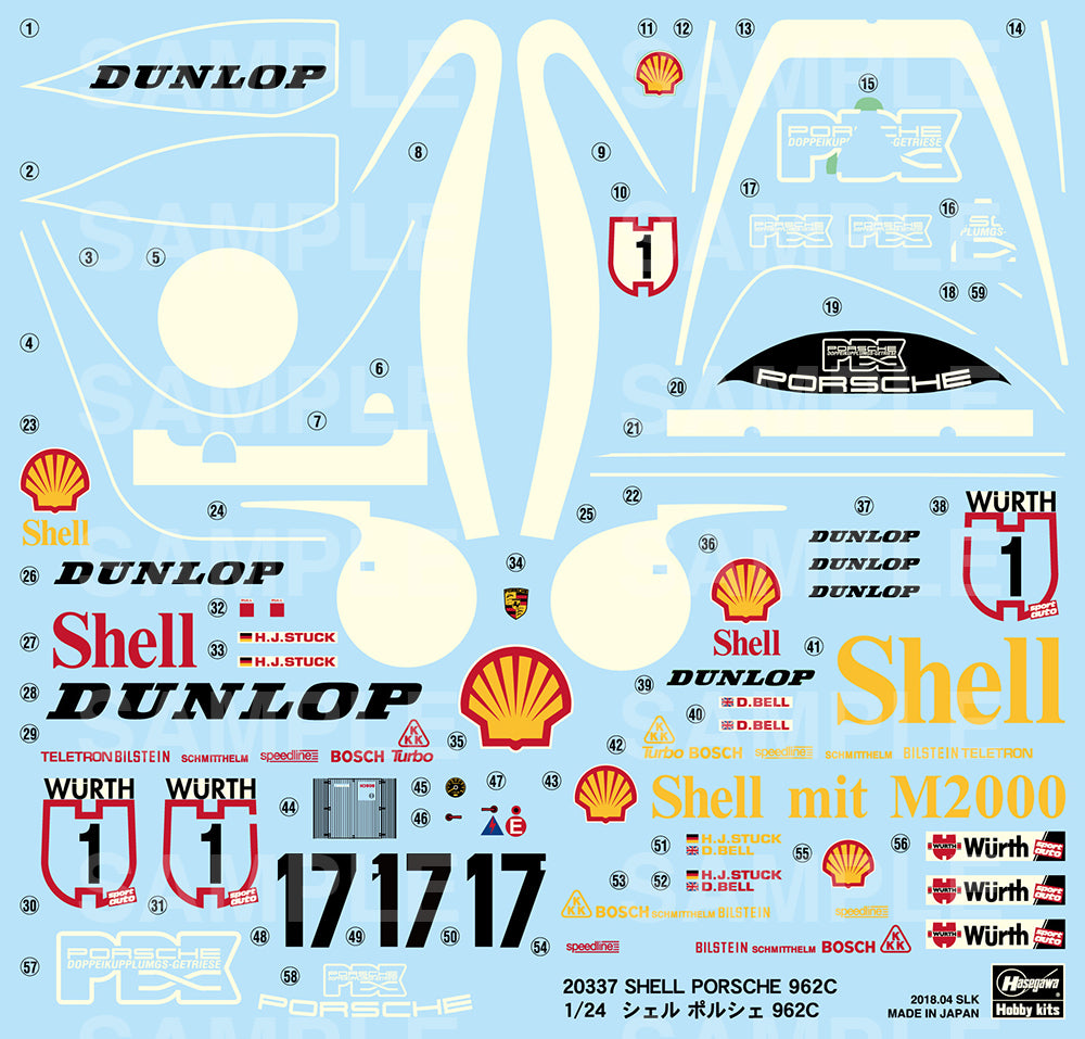 Hasegawa 20337 1/24 scale Shell Porsche 962C. This kit includes parts for the assembly of one plastic model kit. The set requires both glue and paint in order to be completed. Paints and glue are not included. For modelers aged 14 and older