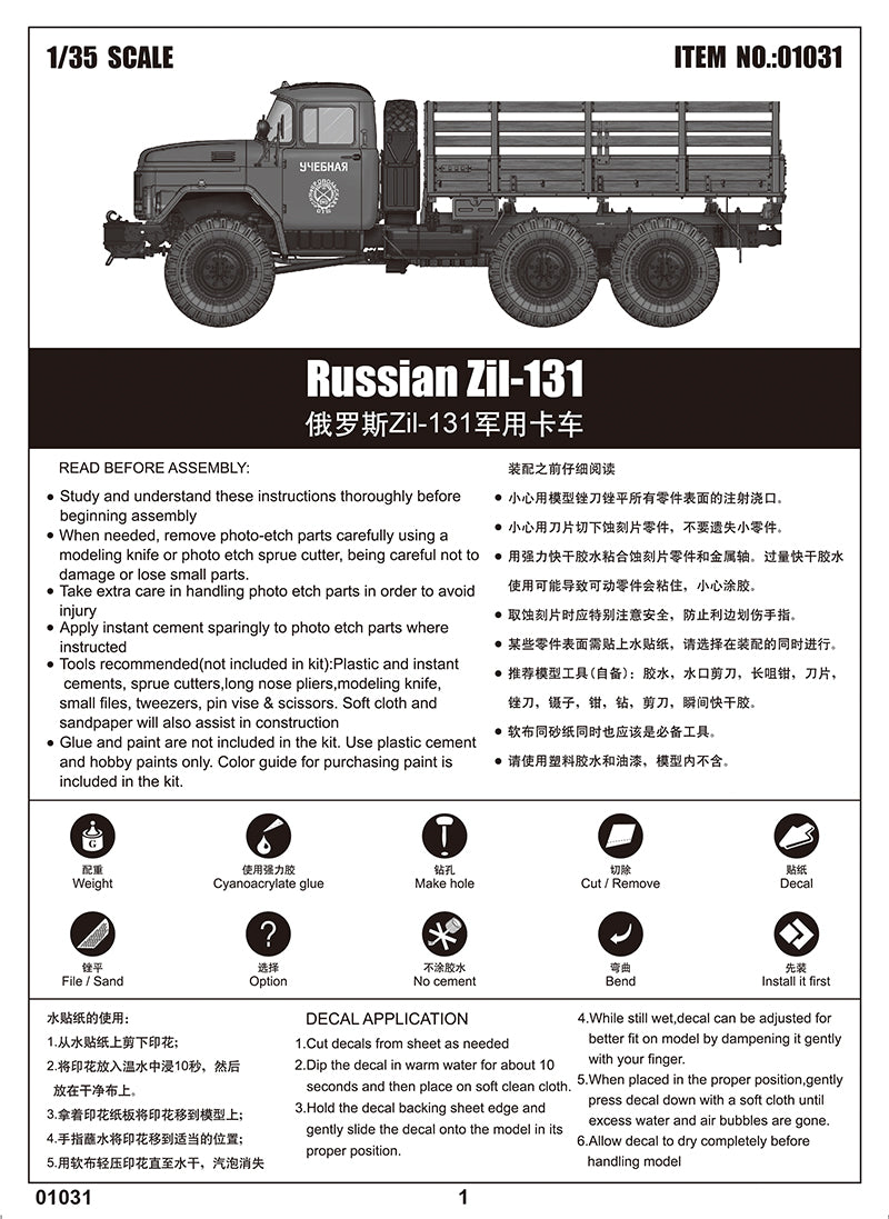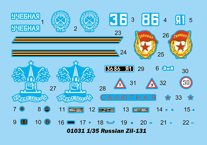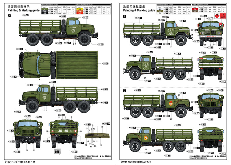 Trumpeter 1031 1/35 scale Russian Zil-131. This kit includes parts for the assembly of one plastic model kit. The set requires both glue and paint in order to be completed. Paints and glue are not included. For modelers aged 14 and older