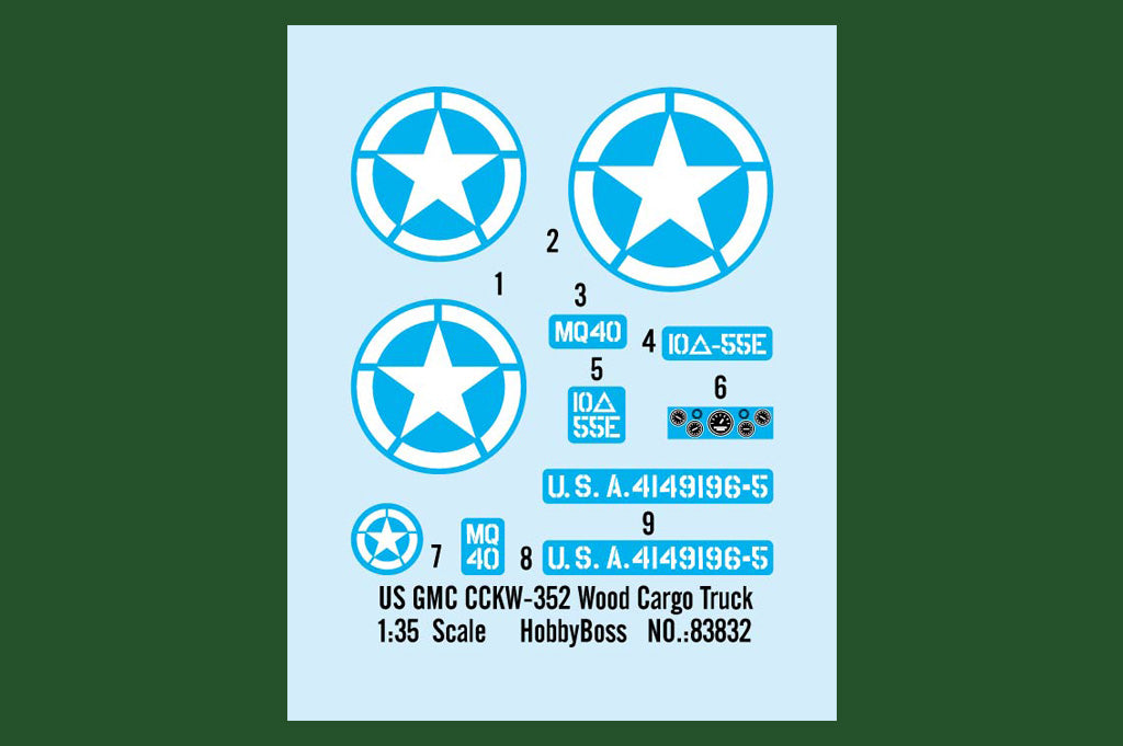 Hobby Boss 83832 1/35 scale US GMC CCKW-352 Wood Cargo Truck. This kit includes parts for the assembly of one plastic model kit. The set requires both glue and paint in order to be completed. Paints and glue are not included. For modelers aged 14 and older