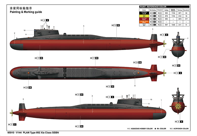 Trumpeter 5910 1/144 scale PLAN Type 092 Xia Class SSBN. This kit includes parts for the assembly of one plastic model kit. The set requires both glue and paint in order to be completed. Paints and glue are not included. For modelers aged 14 and older