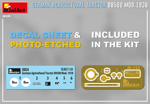 Miniart 38024 1/35 scale German Agricultural Tractor D8500 Mod. 1938. This kit includes parts for the assembly of one plastic model kit. The set requires both glue and paint in order to be completed. Paints and glue are not included. For modelers aged 14 and older