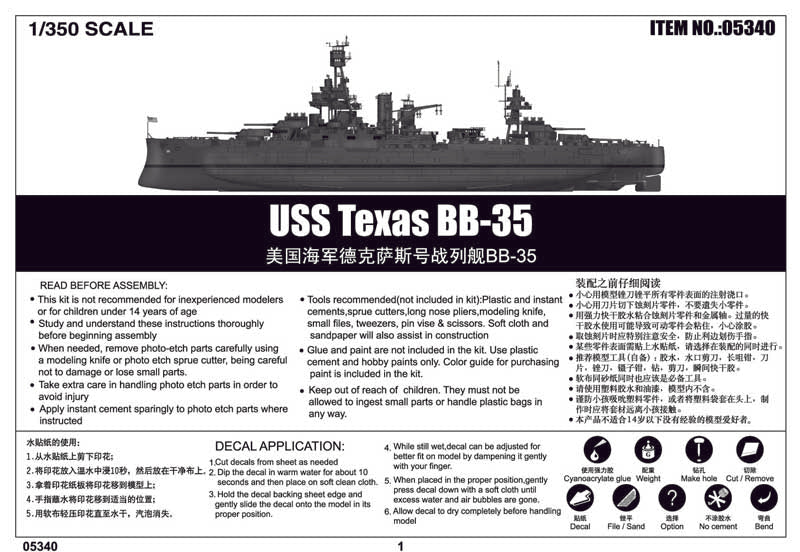 Trumpeter 5340 1/350 scale USS Texas BB-35. This kit includes parts for the assembly of one plastic model kit. The set requires both glue and paint in order to be completed. Paints and glue are not included. For modelers aged 14 and older