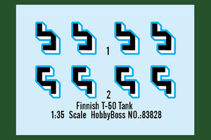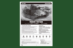 Hobby Boss 83828 1/35 scale Finnish T50 Tank. This kit includes parts for the assembly of one plastic model kit. The set requires both glue and paint in order to be completed. Paints and glue are not included. For modelers aged 14 and older