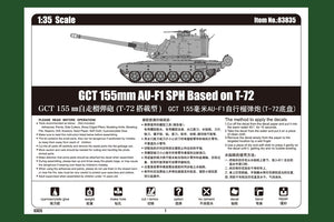 Hobby Boss 83835 1/35 scale GCT 155mm AU-F1 SPH Based on T-72. This kit includes parts for the assembly of one plastic model kit. The set requires both glue and paint in order to be completed. Paints and glue are not included. For modelers aged 14 and older