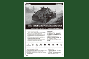 Hobby Boss 83811 1/35 scale German Sd.Kfz.221 Leichter Panzerspahwagen (1st Series). This kit includes parts for the assembly of one plastic model kit. The set requires both glue and paint in order to be completed. Paints and glue are not included. For modelers aged 14 and older