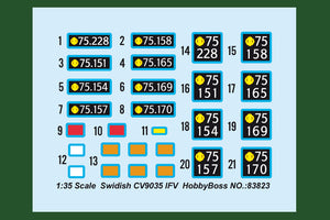 Hobby Boss 83823 1/35 scale Swedish CV9035 IFV. This kit includes parts for the assembly of one plastic model kit. The set requires both glue and paint in order to be completed. Paints and glue are not included. For modelers aged 14 and older