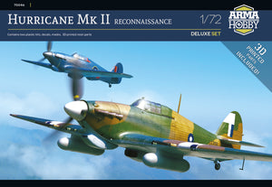 Arma Hobby 70046 1/72 scale Hurricane Mk II Reconnaissance, DLX Set. This kit includes parts for the assembly of two plastic model kits. The set requires both glue and paint in order to be completed. Paints and glue are not included. For modelers aged 14 and older