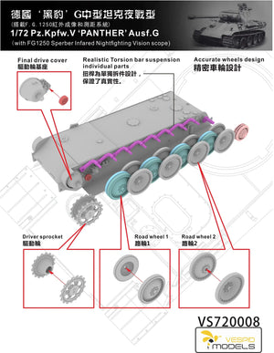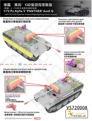 Vespid Models 720008 1/72 scale Pz.Kpfw.V Panther Ausf.G w/FG1250 Sperber Infared Nightfighting Vision scope. This kit includes parts for the assembly of one plastic model kit. The set requires both glue and paint in order to be completed. Paints and glue are not included. For modelers aged 14 and older