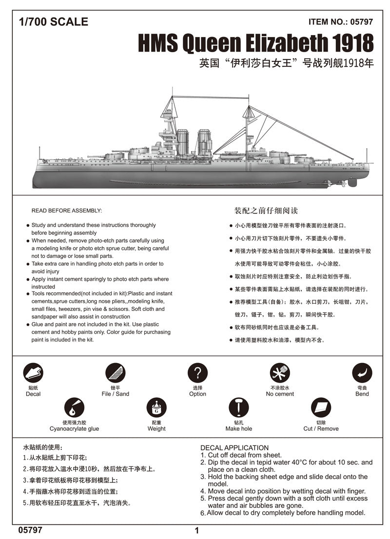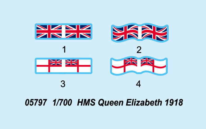 Trumpeter 5797 1/700 scale HMS Queen Elizabeth 1918. This kit includes parts for the assembly of one plastic model kit. The set requires both glue and paint in order to be completed. Paints and glue are not included. For modelers aged 14 and older