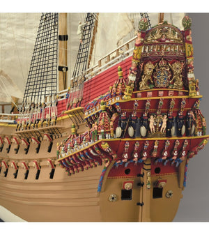 The warship model kit of the Swedish boat Vasa 1/65 contains one of the most detailed replicas of the history on the market, especially thanks to a large number of carvings on its stern, not forgetting some in the bow. Of course, the Vasa ship model includes a large set of decoration parts in die-cast and photo-etched, which gives the ship a spectacular beauty.