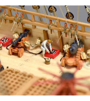 The expert modeler, to whom this scale model is aimed, will also find premium quality wood parts, hand-sewn sails ready to be placed and ... Two bonuses included as a gift! An exhibition base in wood with a nominative metal plate and six figurines will give this naval jewel even more realism.