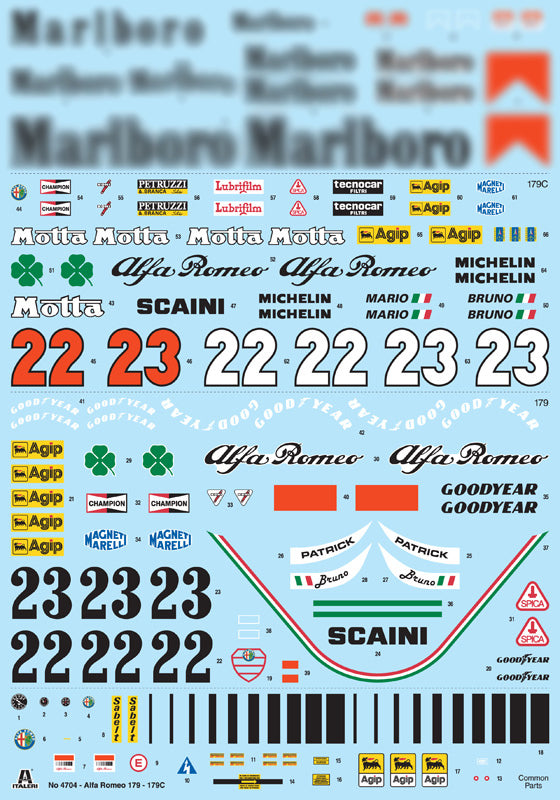 Italeri 4704 1/12 scale Alfa Romeo 179/179c. This kit includes parts for the assembly of one plastic model kit. The set requires both glue and paint in order to be completed. Paints and glue are not included. For modelers aged 14 and older