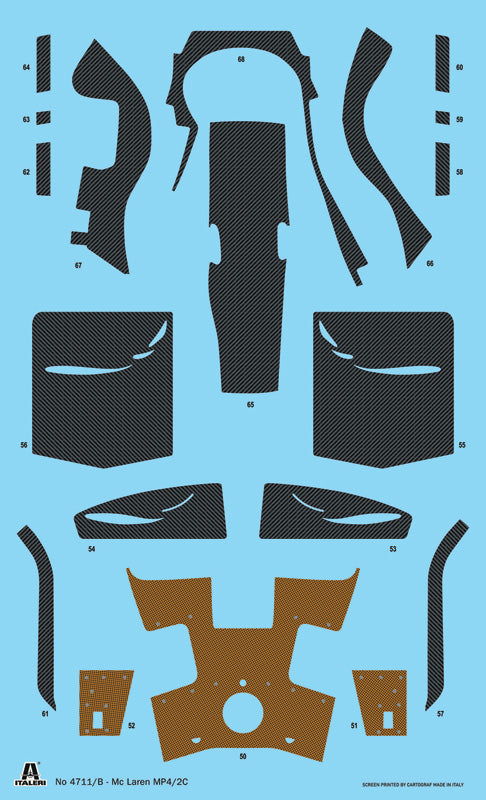 Italeri 4711 1/12 scale McLaren MP4/2C Prost-Rosberg. This kit includes parts for the assembly of one plastic model kit. The set requires both glue and paint in order to be completed. Paints and glue are not included. For modelers aged 14 and older
