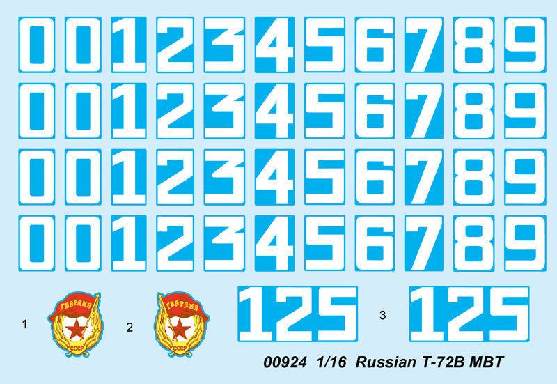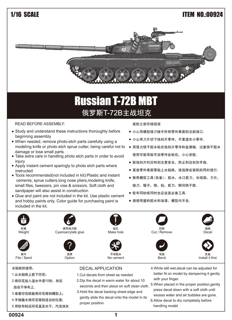 Trumpeter 924 1/16 scale Russian T72B MBT. This kit includes parts for the assembly of one plastic model kit. The set requires both glue and paint in order to be completed. Paints and glue are not included. For modelers aged 14 and older