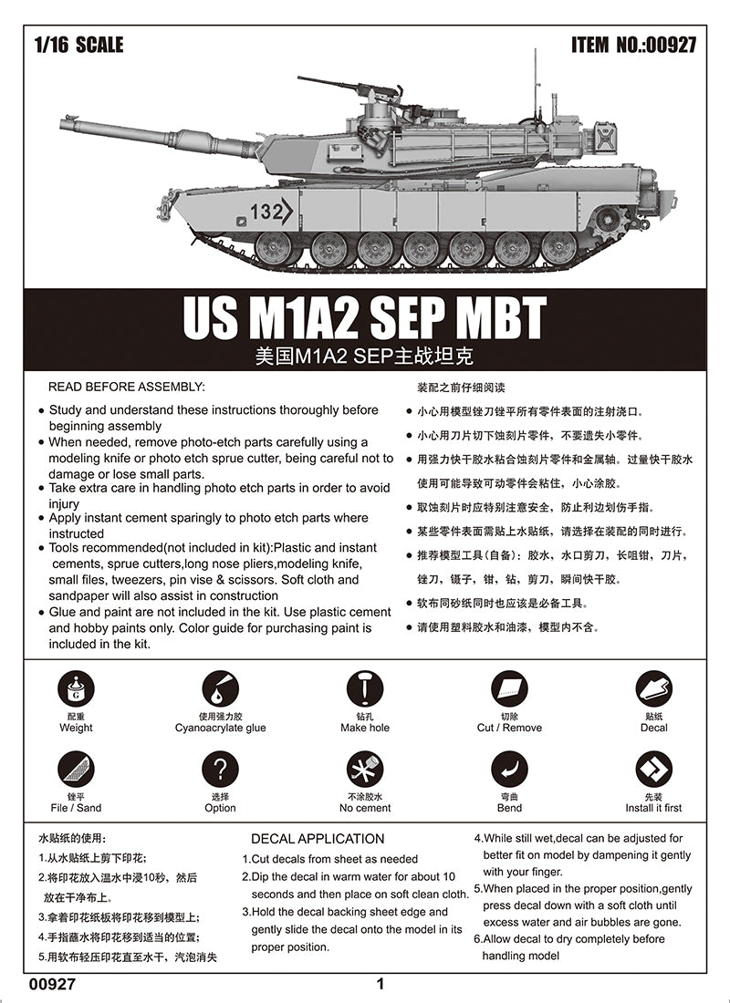 Trumpeter 927 1/16 scale US M1A2 SEP MBT Abrams. This kit includes parts for the assembly of one plastic model kit. The set requires both glue and paint in order to be completed. Paints and glue are not included. For modelers aged 14 and older.