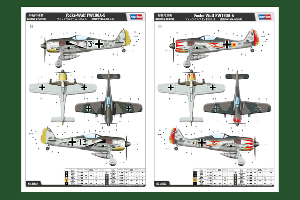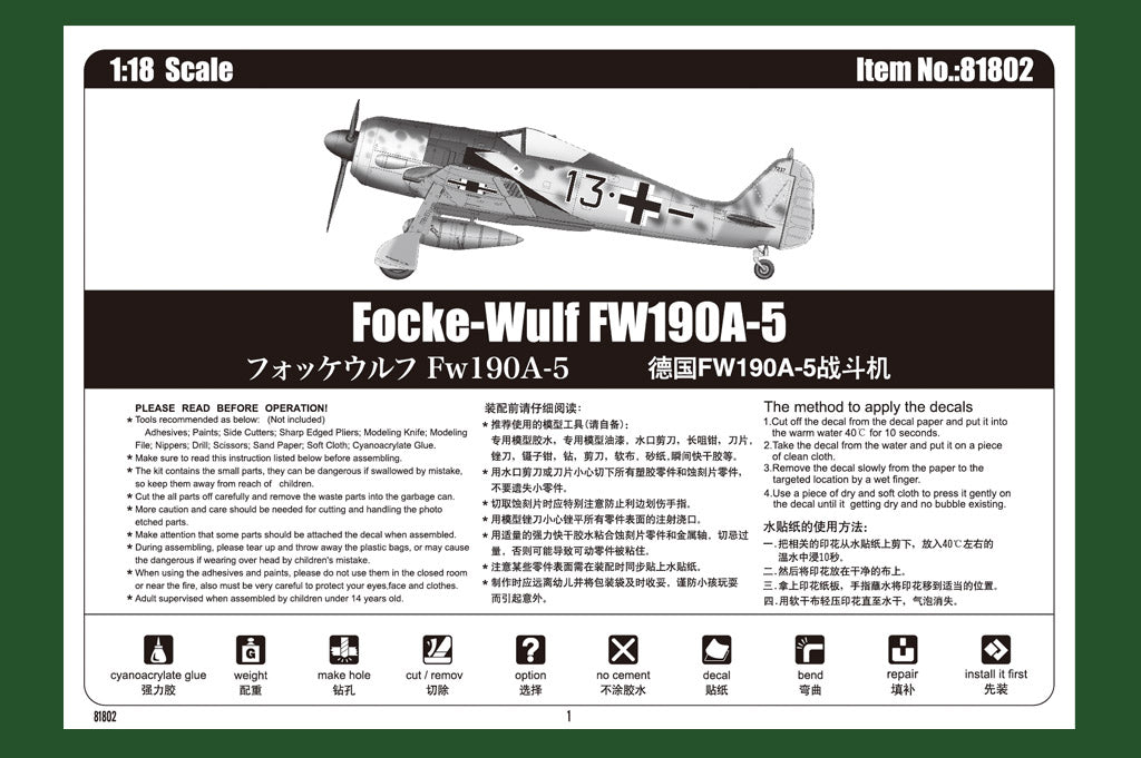 Hobby Boss 81802 1/18 scale Focke-Wulf FW 190A-5. This kit includes parts for the assembly of one plastic model kit. The set requires both glue and paint in order to be completed. Paints and glue are not included. For modelers aged 14 and older