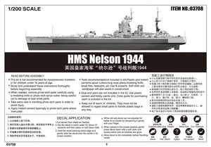 Trumpeter 3708 1/200 scale HMS Nelson 1944. This kit includes parts for the assembly of one plastic model kit. The set requires both glue and paint in order to be completed. Paints and glue are not included. For modelers aged 14 and older