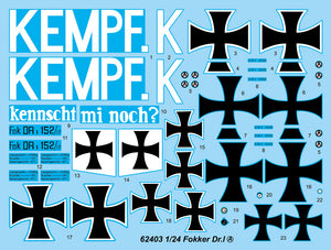 I love Kit 62403 1/24 scale Fokker Dr.I. This kit includes parts for the assembly of one plastic model kit. The set requires both glue and paint in order to be completed. Paints and glue are not included. For modelers aged 14 and older