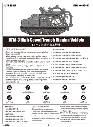Trumpeter 9502 1/35 scale BTM3 High Speed Trench Digging Vehicle. This kit includes parts for the assembly of one plastic model kit. The set requires both glue and paint in order to be completed. Paints and glue are not included. For modelers aged 14 and older