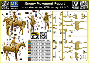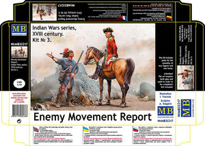 Master Box 35217 1/35 scaler Enemy Movement Report. Indian Wars Series, XVIII century. Kit No. 3. This kit includes parts for the assembly of two figures and one horse. The set requires both glue and paint in order to be completed. Paints and glue are not included. For modelers aged 14 and older